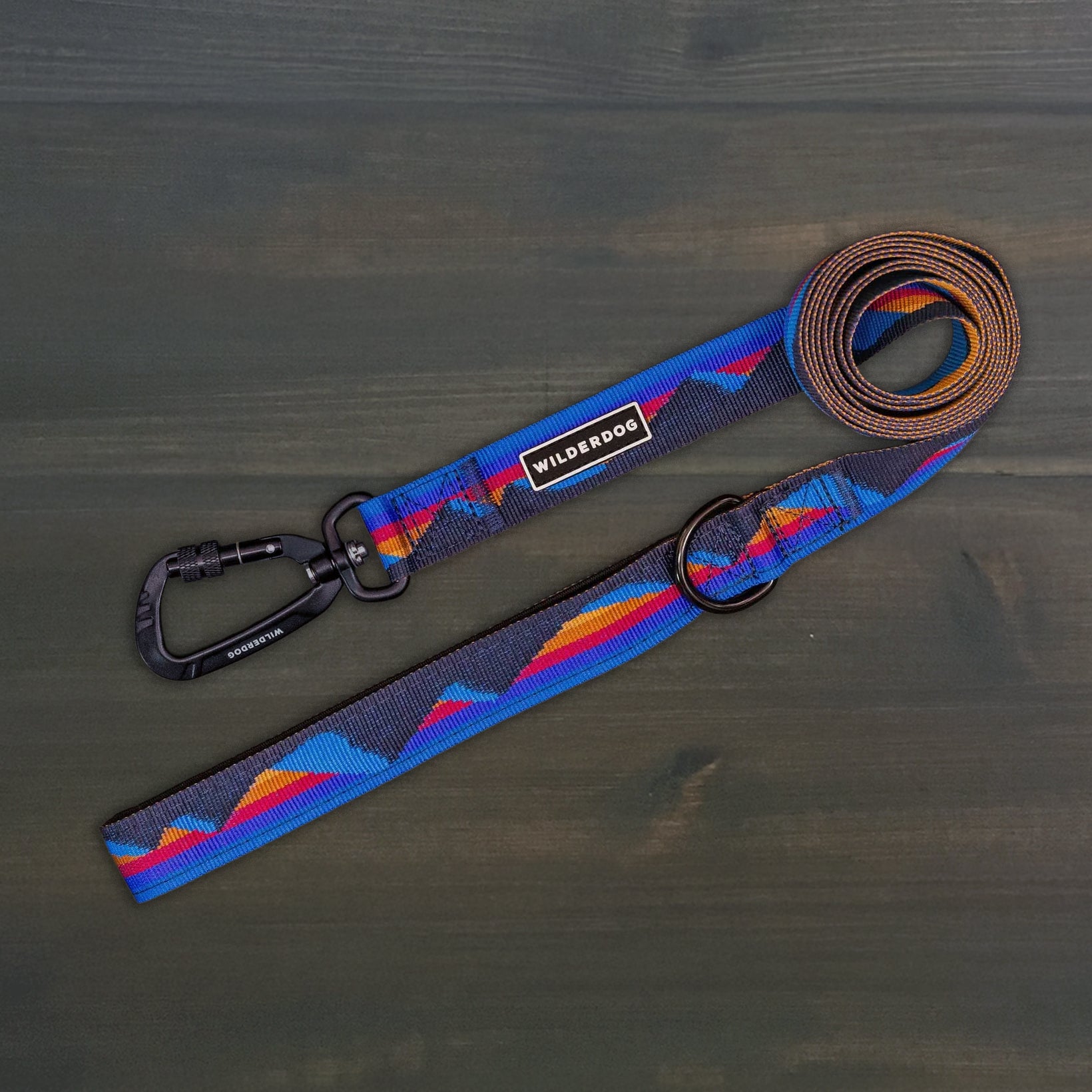 A Cordillera Ultralight Leash in blue with a geometric design, made from ultralight nylon, attached to retail packaging that displays the Wilderdog logo and product details on a tan, topographic map-themed background.