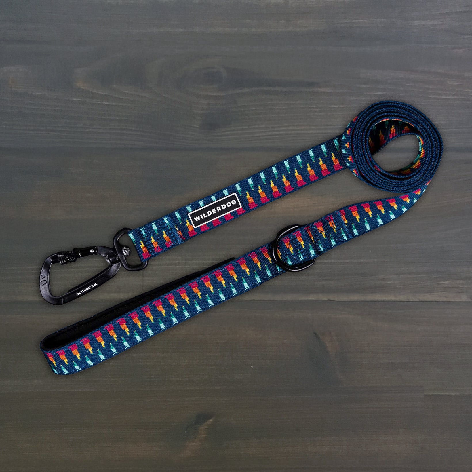 A package containing a Marina Ultralight Leash. The leash features a colorful pattern with shapes in red, blue, and yellow on a black background, crafted from durable nylon webbing and equipped with an aluminum carabiner. The brown packaging displays the brand name "WILDERDOG" at the top.