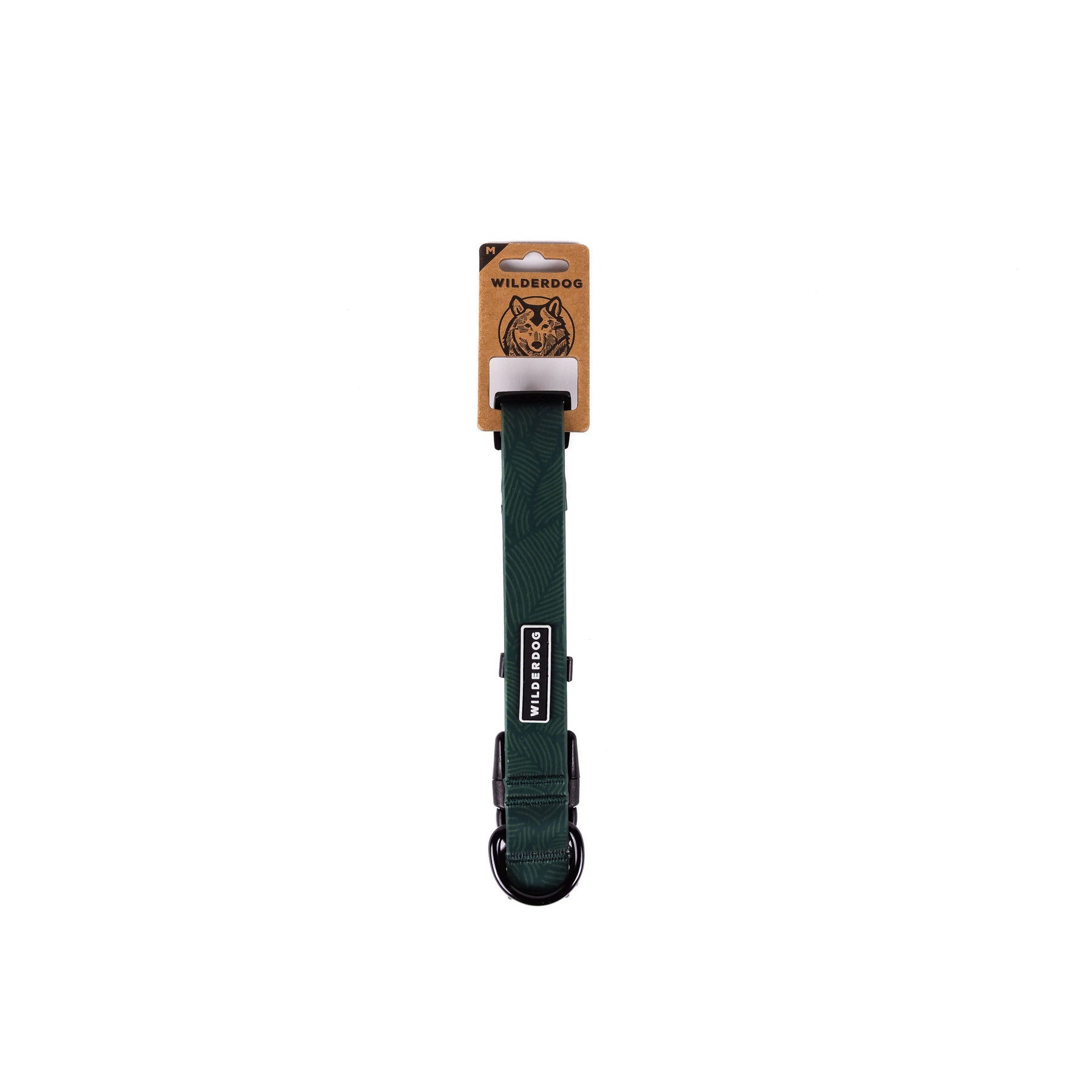 A brown dog wearing the Cedar Waterproof Collar sits attentively on a forest path, looking up at its owner holding the leash. Ferns and greenery fill the background.