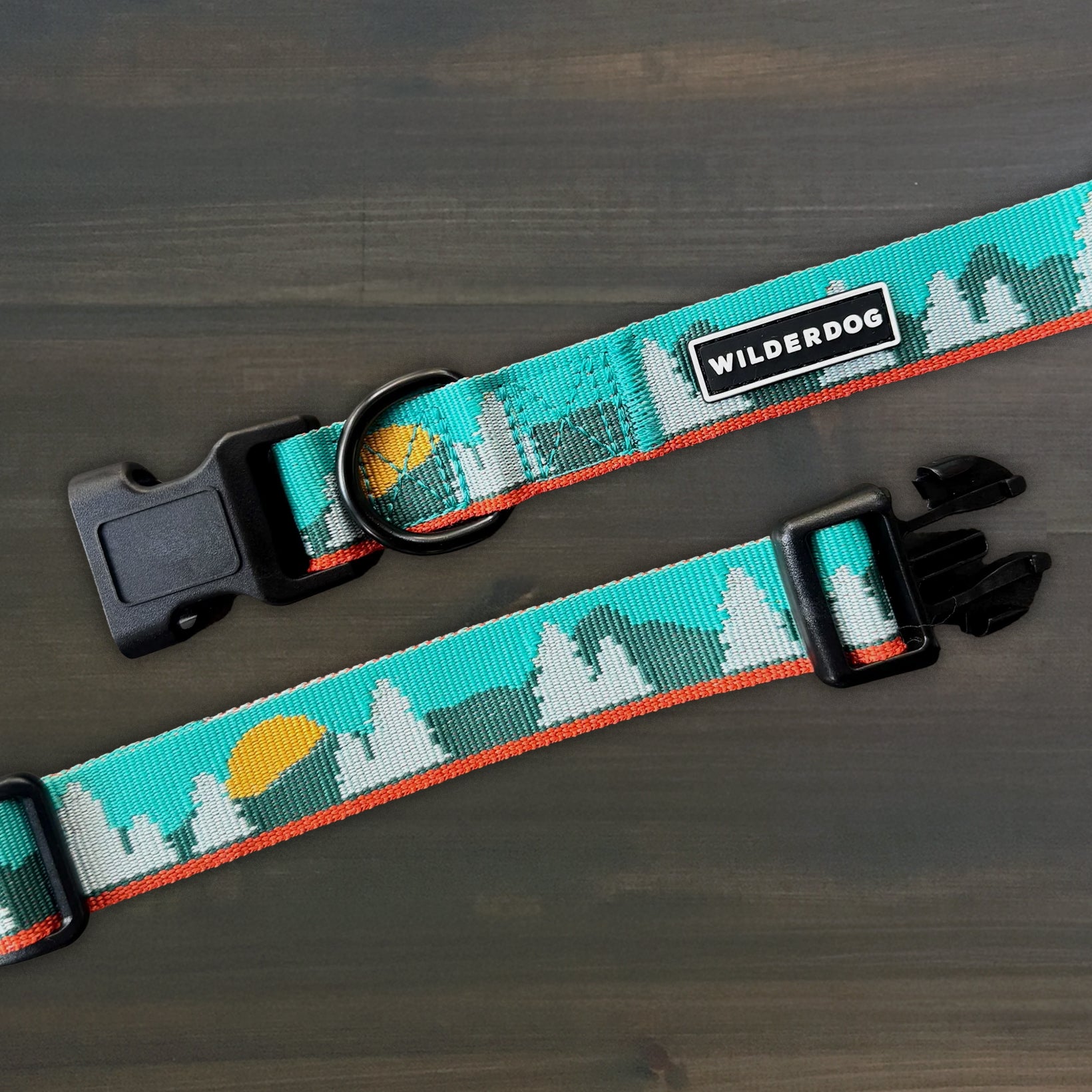Three Tamarack Ultralight Collars, each with turquoise and orange patterns, are displayed vertically on a dark wooden surface. Each lightweight collar is attached to branded cardboard packaging featuring a dog illustration.