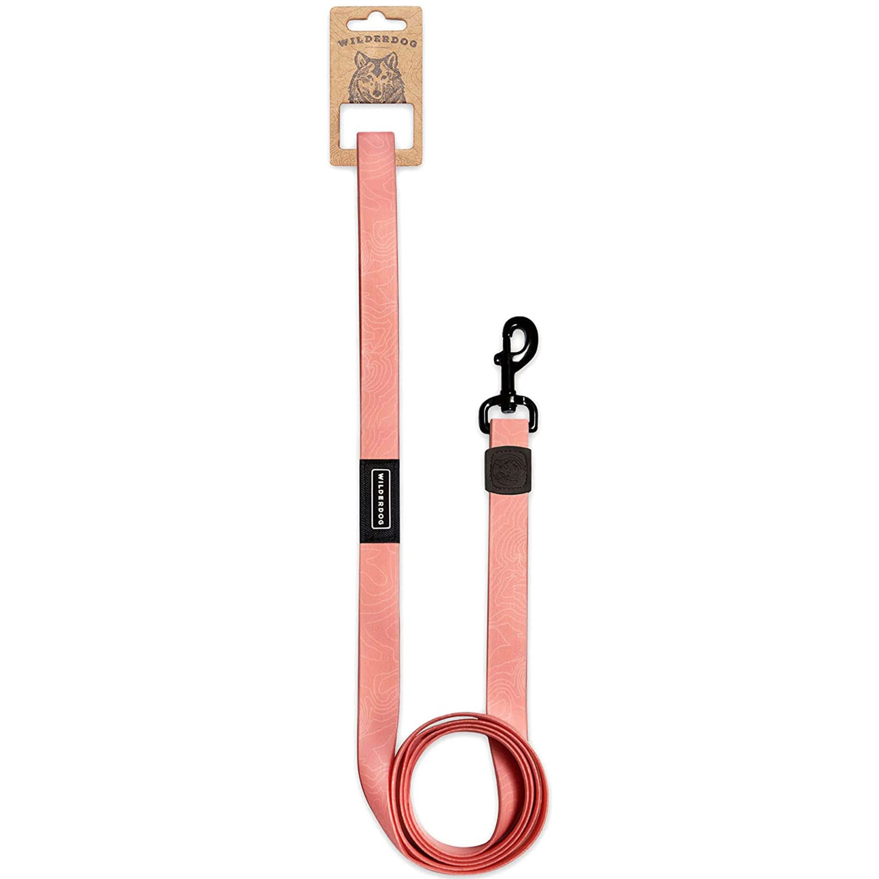 A Guava Waterproof Leash coiled neatly on a wooden surface. The durable dog leash features a pink fabric strap with a metal tag displaying the Wilderdog brand. The clasp is visible at one end, designed for attaching to a dog collar.