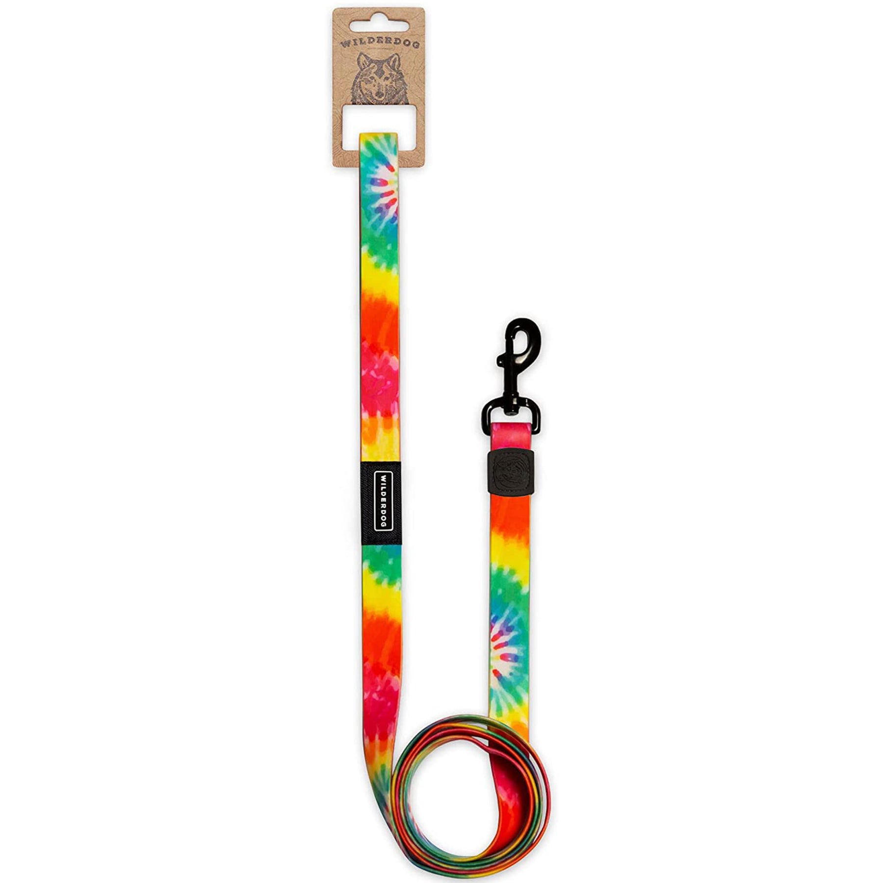 A vibrant Tie Dye Waterproof Leash + Collar Bundle (x) labeled "WILDERDOG" rests coiled on a dark wooden surface, highlighting durable, stink-proof dog gear made for adventure.